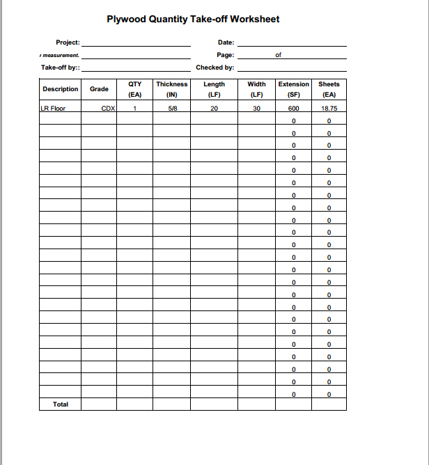 In this way, you will get a clear understanding of the expenses to the bidding process in early basis. The plywood quantity takeoff sheet contains: thickness, length, width and extension.
