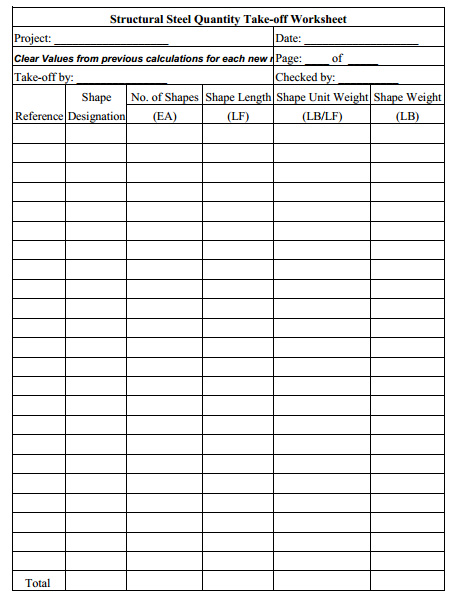 The structural steel takeoff sheets are utilized to compute structural steel erection, miscellaneous-steel work activities, steel decking and siding installation, rebar placement, pre-engineered building assembly and pricing contract change orders as well as other steel associated construction work activities by applying some in-built formulas.